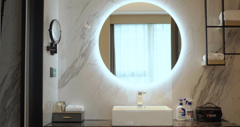 客房卫生间则选用了明净利落的冠珠岩板「卡拉拉灰白」,其简约流畅的线条勾勒出灵动氛围,与客房其他区域以不同的格调共同营造出静谧、舒适的休憩之境。在长沙延年城际酒店,冠珠岩板大面积应用于宴会厅、会议厅、餐厅及客房等多个核心区域,凭借多元丰富的花色体系与灵活多样的产品规格,与不同空间的气质需求实现了精准契合。