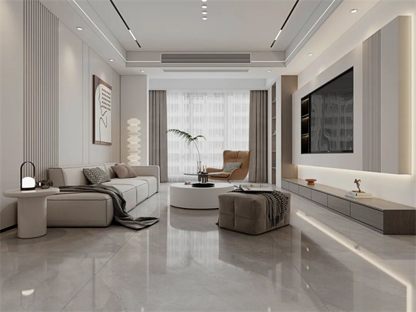 丝丝细纹渗透出石纹韵律,灰白纹理的浅灰砖面上自然流畅交织在一起,使得视觉开阔明亮,大范围的铺贴让纹理延伸出更有张力、更具质感的人居美学,与家具、装饰品等进行搭配,营造出和谐统一的整体氛围。