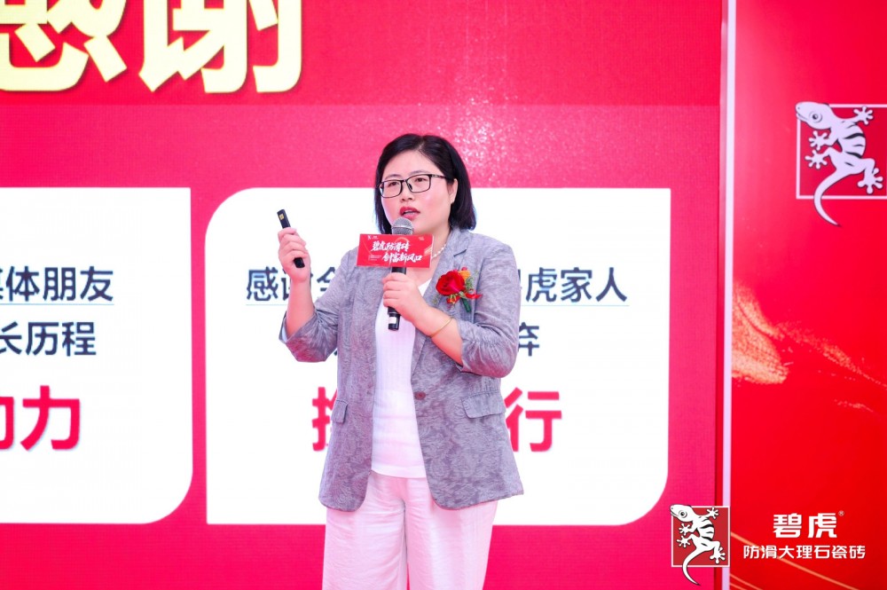 碧虎总经理高玉秀则聚焦“终端创富”,分享实战方法论。她提出“终端不是卖产品的地方,是攒口碑、聚人心的地方”。碧虎防滑大理石瓷砖以“中国瓷砖防滑王”的行业领军者姿态,通过科技创新与立体营销双轮驱动,开创陶瓷行业功能化新赛道。品牌凭借国家认证的国际先进防滑技术(静摩擦系数>0.7)和“防滑=碧虎”的消费者心智占位,构建起覆盖全国900+经销商的网络体系,其360°立体营销帮扶系统更以19.8万元价值赋能合作伙伴,从门店动销、线上引流到区域招商实现全周期闭环管理。