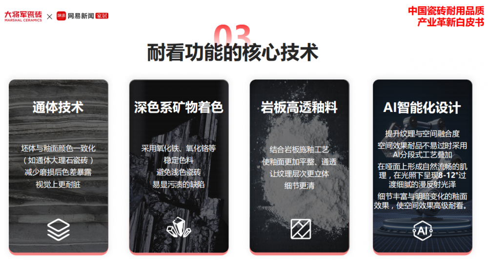 作为大会的另一高光时刻,网易家居、网易设计全国总编辑胡艳力正式发布《2025中国瓷砖耐用品质产业革新白皮书》。该白皮书由大将军瓷砖联合权威媒体与专业研究机构共同编撰,是行业首部聚焦“耐用”价值的系统性产业指南。她强调,耐用不仅是产品性能的体现,更应成为品牌价值的核心维度。这份白皮书立足当下、面向未来,不仅总结了当前技术成果,更为行业树立了可衡量、可追溯、可信赖的品质新标尺。