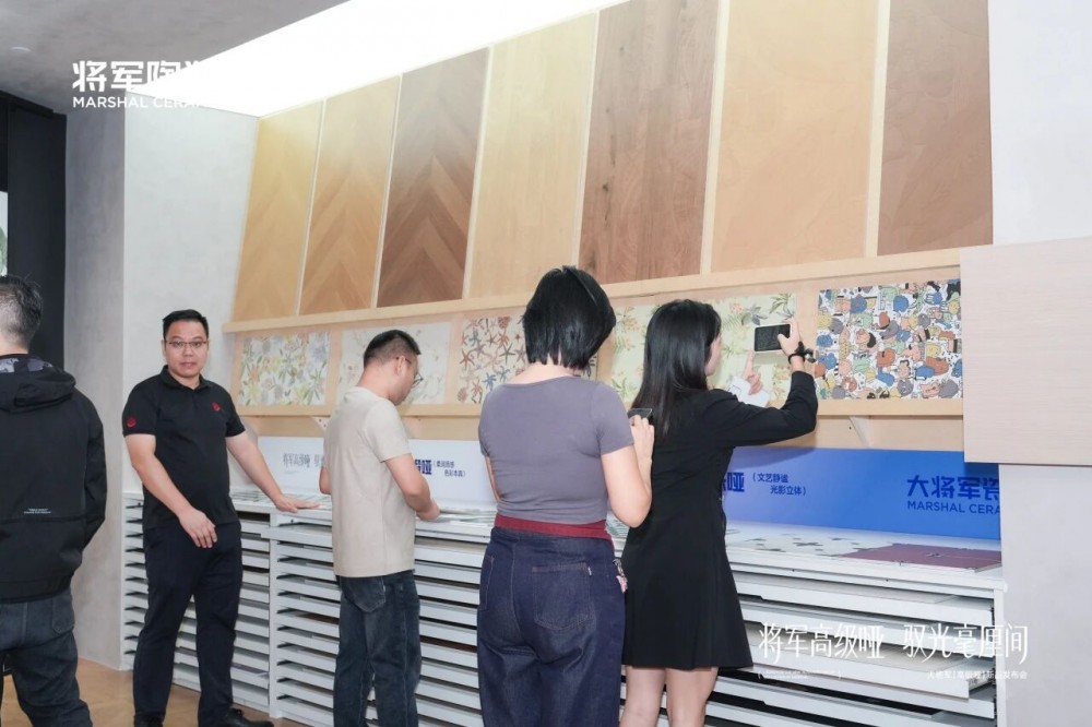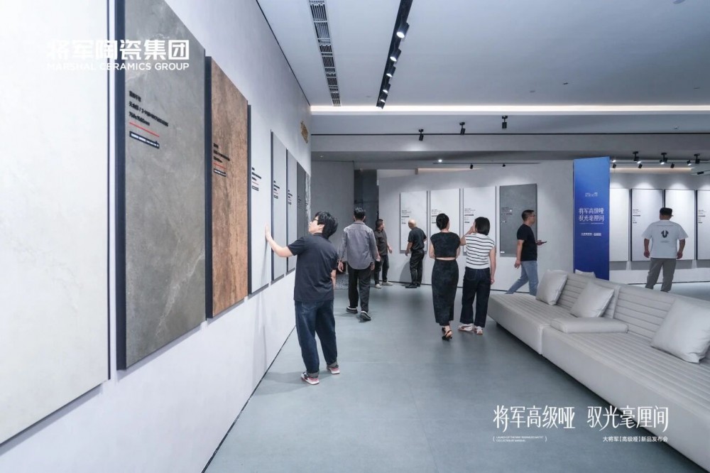 活动期间,与会嘉宾移步展厅,近距离品鉴大将军“高级哑”系列新品的非凡魅力。在光影交织的空间中,新品以温润的触感、细腻的肌理与丰富的哑光质感,诠释着“驭光毫厘间”的极致美学。合作伙伴们驻足细览,深入交流,对产品在设计创新、工艺技术与耐用性能上的全面突破给予高度评价。