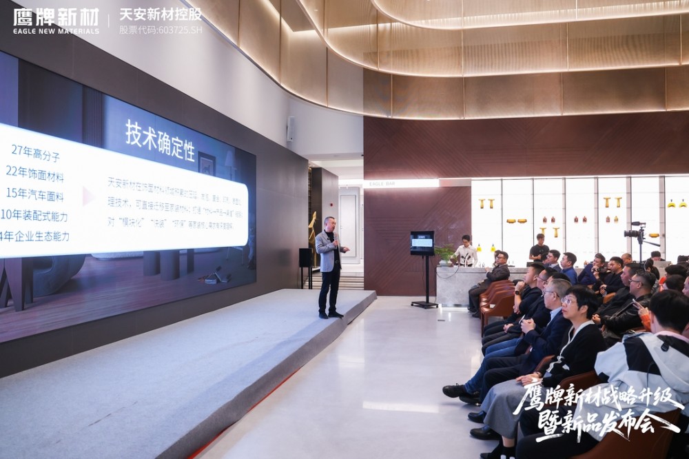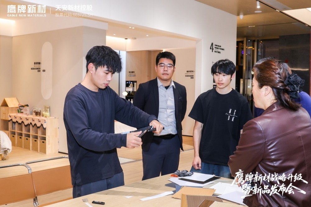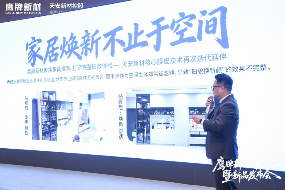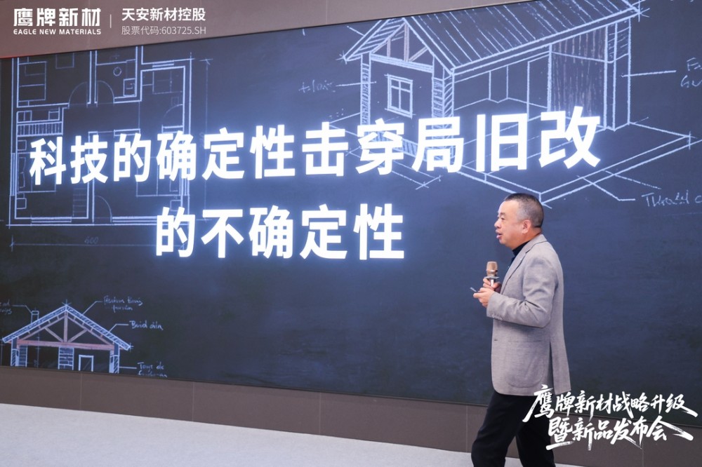 “科技的确定性击穿局旧改的不确定性”,吴董指出天安新材25年深耕柔性材料的科技创新,集团打通“材料-产品-渠道”的核心战略,完成从单一材料制造商到健康家居生态平台构建者的华丽转型。鹰牌新材依托母公司在环保饰面材料领域的创新技术积累,从功能满足到情感共鸣,真正解决消费者的核心痛点,提供"确定性的美好体验"。