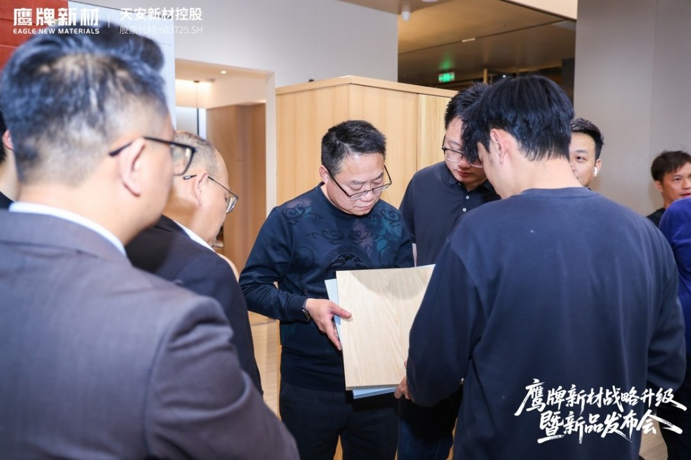 天安新材/鹰牌实业董事长吴启超,鹰牌实业总裁陈贤伟,鹰牌实业董事&天安新材董事长助理徐芳,鹰牌实业常务副总裁白秀芬,鹰牌实业副总裁陈方根,鹰牌实业副总裁郑雄林,鹰牌实业副总裁姚松榕,鹰牌实业副总裁庄永晖、鹰牌新材事业部总经理王刚刚与鹰牌新材家具改色负责人邝景文等领导及行业媒体、业内精英齐聚一堂,共同见证鹰牌新材战略升级新篇章!