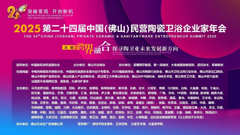 12月18日,第24届中国(佛山)民营陶瓷卫浴企业家年会在佛山皇冠假日酒店盛大启幕。作为全球陶卫产业的年度盛会,本届年会以“跨界融合,探寻陶卫业未来发展新方向”为主题,以“突破变局,开创新机”为口号,汇聚来自全国各地的陶瓷卫浴企业家、行业专家、商协会领导及产业链上下游企业代表,在市场环境低迷、存量竞争加剧的行业背景下,共话升级转型路径,凝聚发展共识。