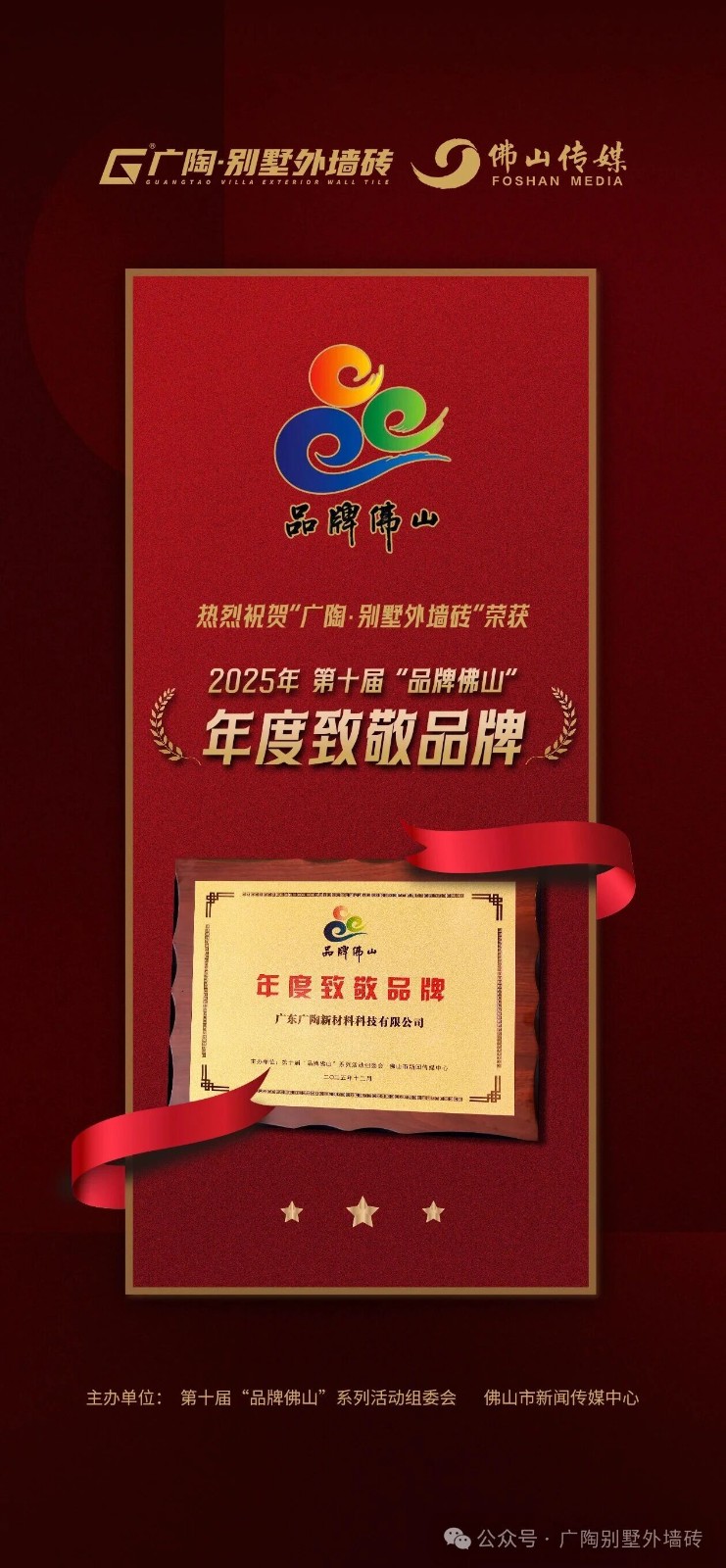 2025年12月18日,由佛山市新闻传媒中心主办的“第十届品牌佛山系列活动成果发布暨经验交流会”在佛山东平保利洲际酒店圆满举行。在这场汇聚佛山品牌力量、见证城市产业升级的年度盛会上,广陶·别墅外墙砖荣获“年度致敬品牌” 大奖。