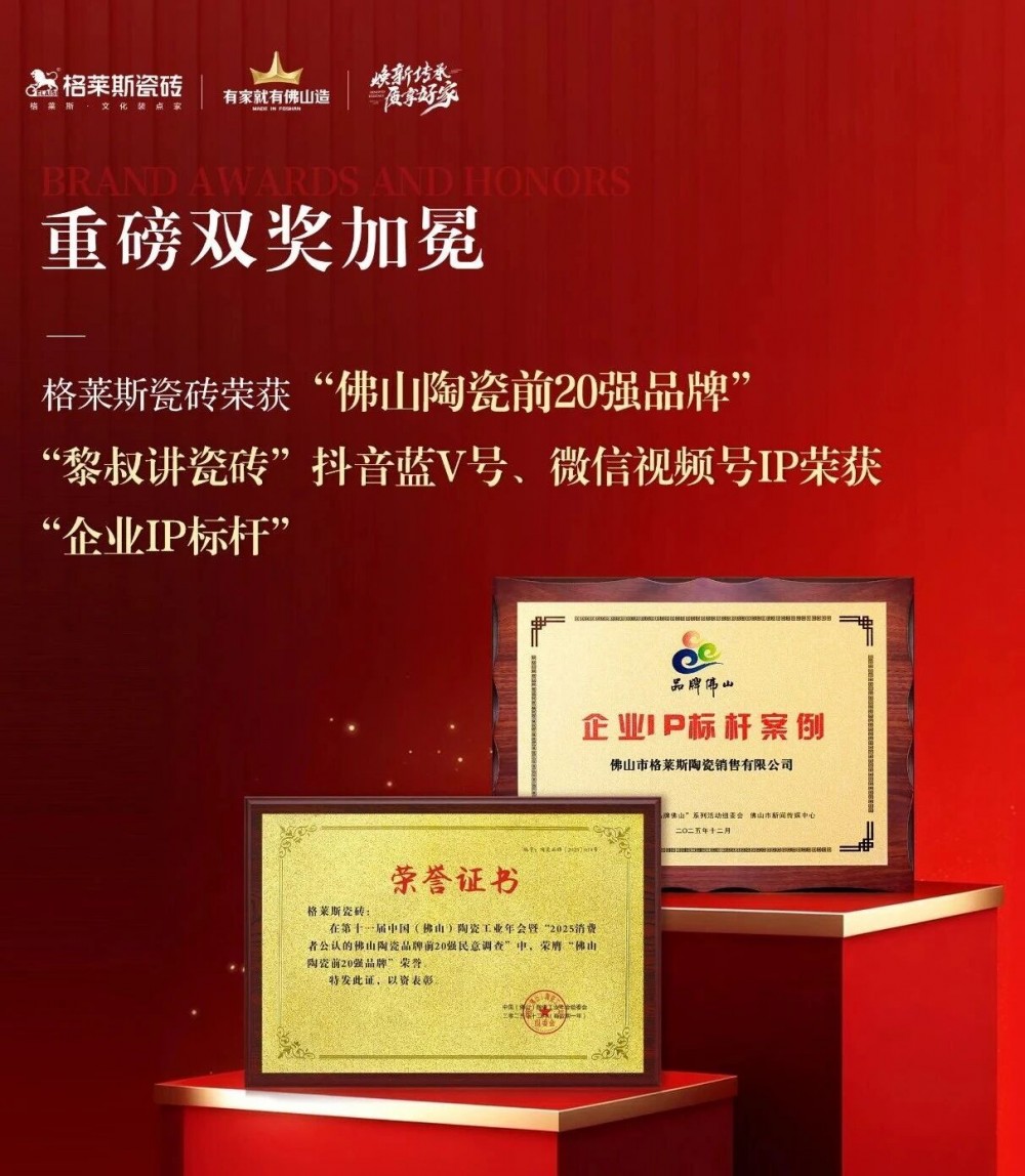 2025年已悄然接近尾声,今年格莱斯努力撰写着品牌发展的解题思路,通过强大的智能制造升级和创新的传播通路打造,焕发着品牌的新活力并获得了媒体的认可,收获了两项重磅品牌殊荣。在2025第十一届中国(佛山)陶瓷工业年会上,实力上榜“佛山陶瓷前20强品牌”,在佛山传媒集团主办的“2025佛山经济年会暨人工智能应用创新大会”上,品牌总经理黎总的“黎叔讲瓷砖”抖音蓝V号、微信视频号IP荣获“企业IP标杆案例”。