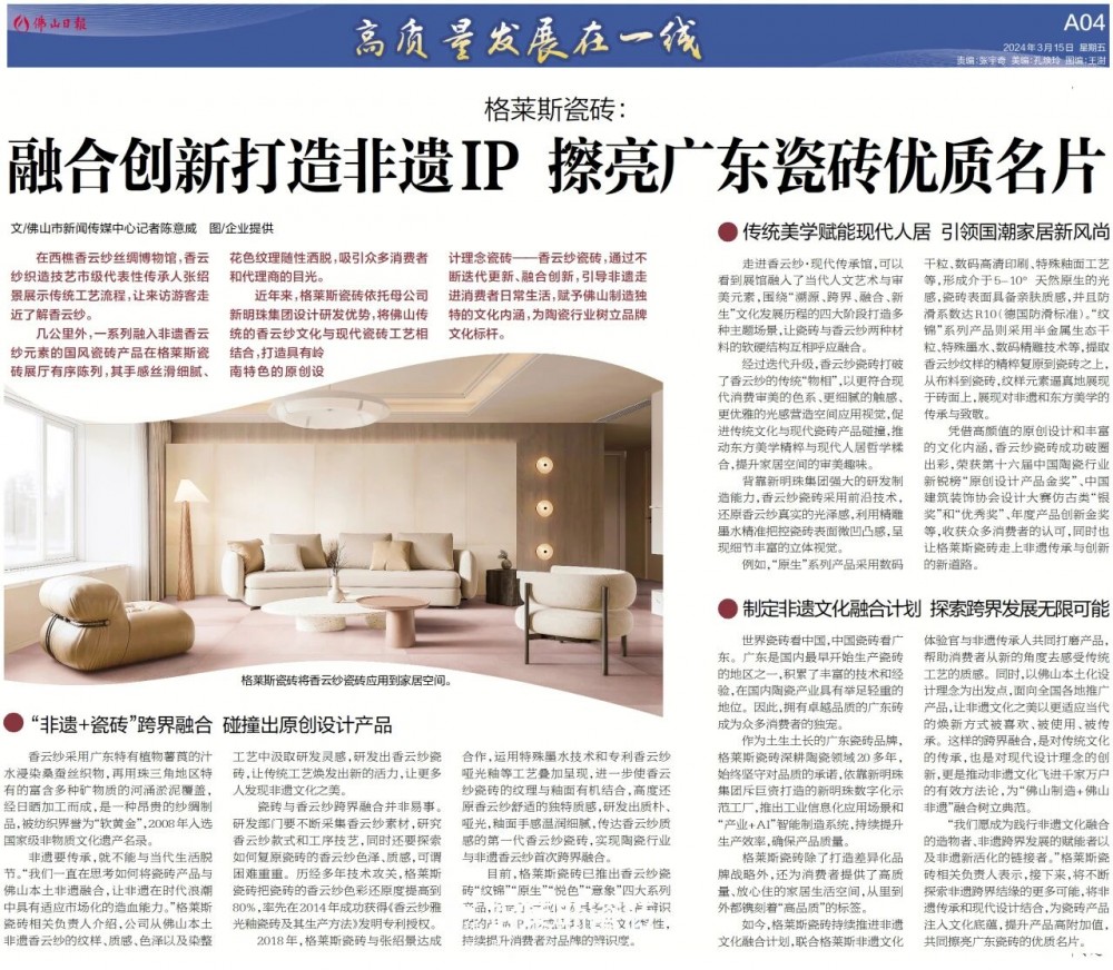 双荣誉加冕是对格莱斯锐意进取的认可,更是品牌铆足干劲的动力来源,作为是土生土长的广东瓷砖品牌,格莱斯瓷砖2001年成立至今,始终以“品质”为企业发展根基,通过数字化创新引入,绿色低碳技改升级,成为行业智能制造的先行者。通过新媒体平台运营,与时代同频打造企业IP标杆,打通品牌高效传播通路,用匠心坚持、主动求变刻画着企业发展的年轮。