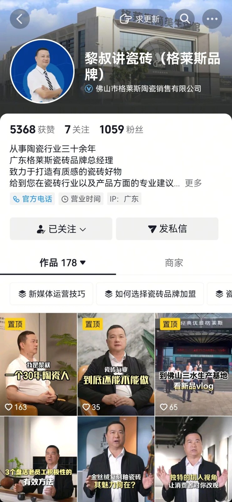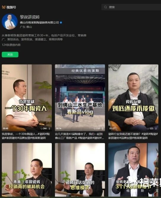 如果说技术创新是捍卫产品品质的后盾,那传播引流便是打开市场销售的利剑,面对市场从“增量抢夺”转变为“存量博弈”,流量触点发生了结构性的变化,抖音、小红书、视频号等线上渠道成为触达消费者的有效路径。格莱斯与趋势同步,2017年便开始构建新媒体矩阵,2024年4月开始打造了品牌总经理黎汝让“黎叔讲瓷砖”的抖音蓝V号和微信视频号IP。资深陶瓷人黎叔亲力亲为,躬身入局为品牌发声,以行动带动团队拥抱时代主动求变,结合热点内容持续输出品牌加盟、瓷砖行业资讯、门店营销和装修避坑等内容,触达潜在品牌目标用户,让用户更立体具象地了解格莱斯的品牌价值,为后续的进一步合租创造更多触点与机会。