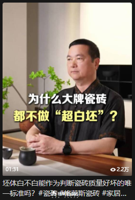 最近一期打造的产品资讯《坯体白不白能作为判断瓷砖质量好坏的唯一标准吗》 ,实现单条视频抖音、视频号双平台自然播放量突破2.2万次,转赞评互动量为1180+,视频涨粉量109。