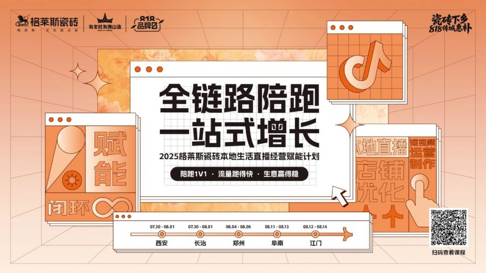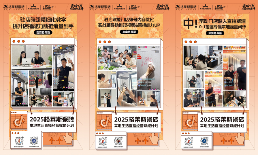 2025年格莱斯瓷砖全新打造了一套“下沉市场+新媒体赋能”的营销驱动模式,推出【本地生活直播经营赋能计划】系统性赋能经销商,通过“总部资源+本地执行”将全国联动大促与抖音本地生活深度结合,推动终端门店开展本地化直播与新媒体运营。